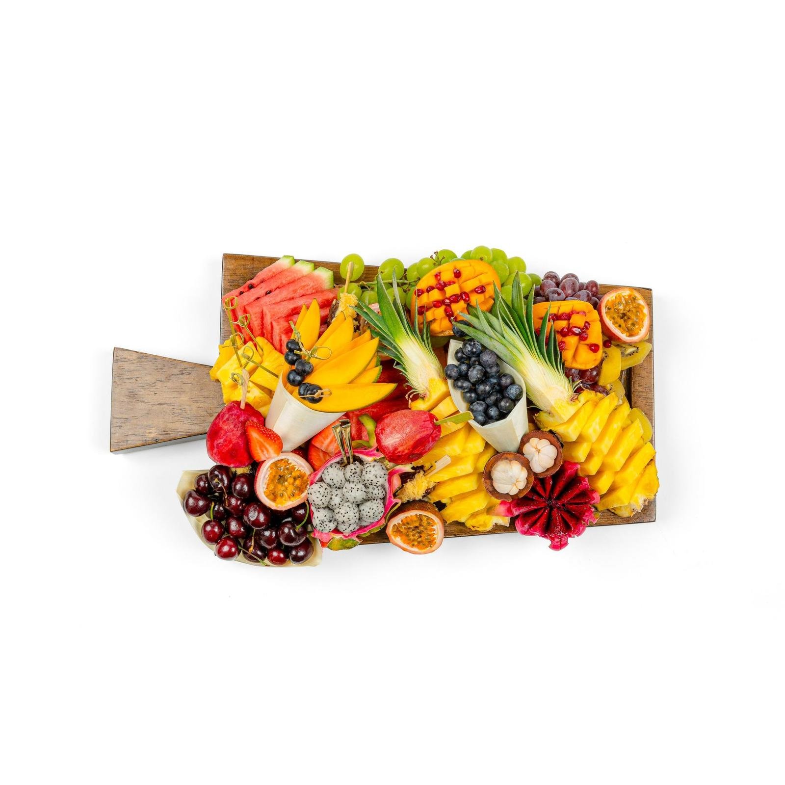 Fruitique Highlights: The ultimate butcher-block experience. Rustic yet refined, this massive solid wood board is overflowing with nature’s harvest—including premium fruits, and our largest selection of whole and sliced tropical fruits.